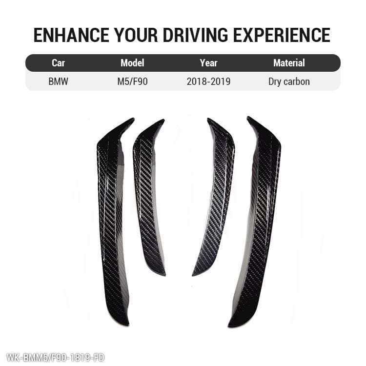 BMW M5 Canard is a premium aerodynamic exterior upgrade designed for the BMW M5 F90 2018-2019. Developed for customers who demand both aggressive styling and functional airflow improvement, this front air knife set is made from dry carbon fiber and is installed with 3M adhesive tape, offering a clean, non-destructive, and efficient installation solution. The standard finish is 3K twill weave in glossy surface, while customized weave, branding, packaging, and OEM production are all available for wholesale buyers, distributors, and performance parts brands.